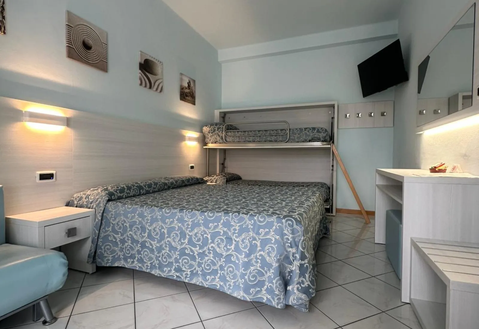 Family con letto a castelloPerfette per famiglie fino a 4 persone, uniscono funzionalità e comfort. Arredate in stile moderno, dispongono di un bagno privato con box doccia e phon, aria condizionata, Wi-Fi, cassaforte, TV-Sat, telefono, ventilatore e mini-frigo. Dispongono anche di un balcone privato. |